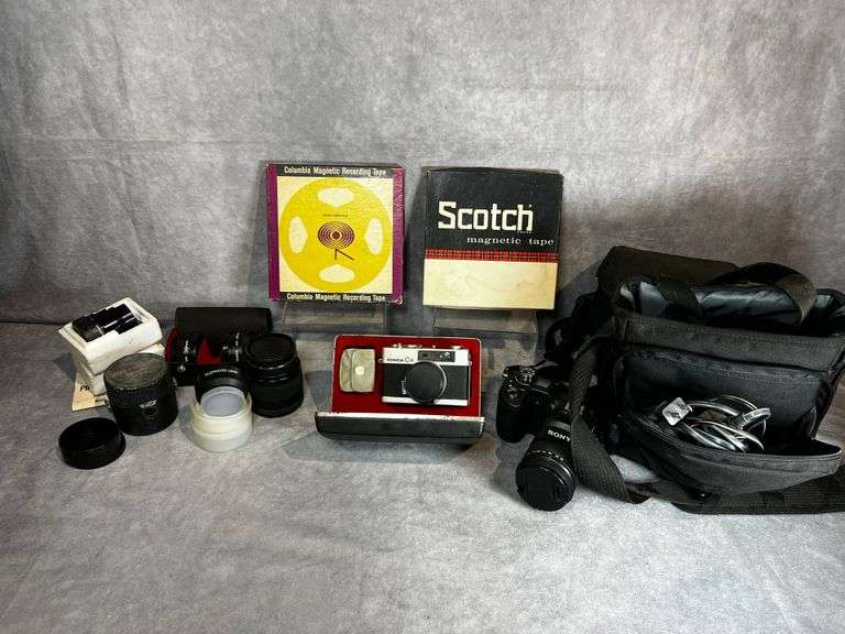 Sony powered on but immediately died, the battery will likely need a while on the charger and/or replaced. Also includes several lenses and more